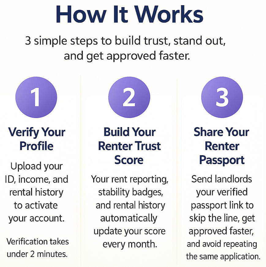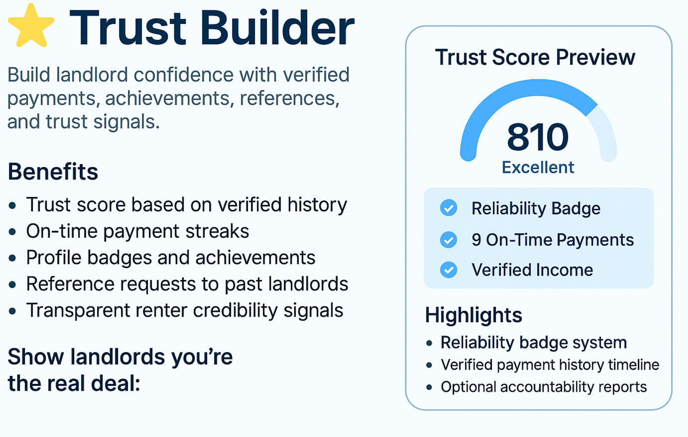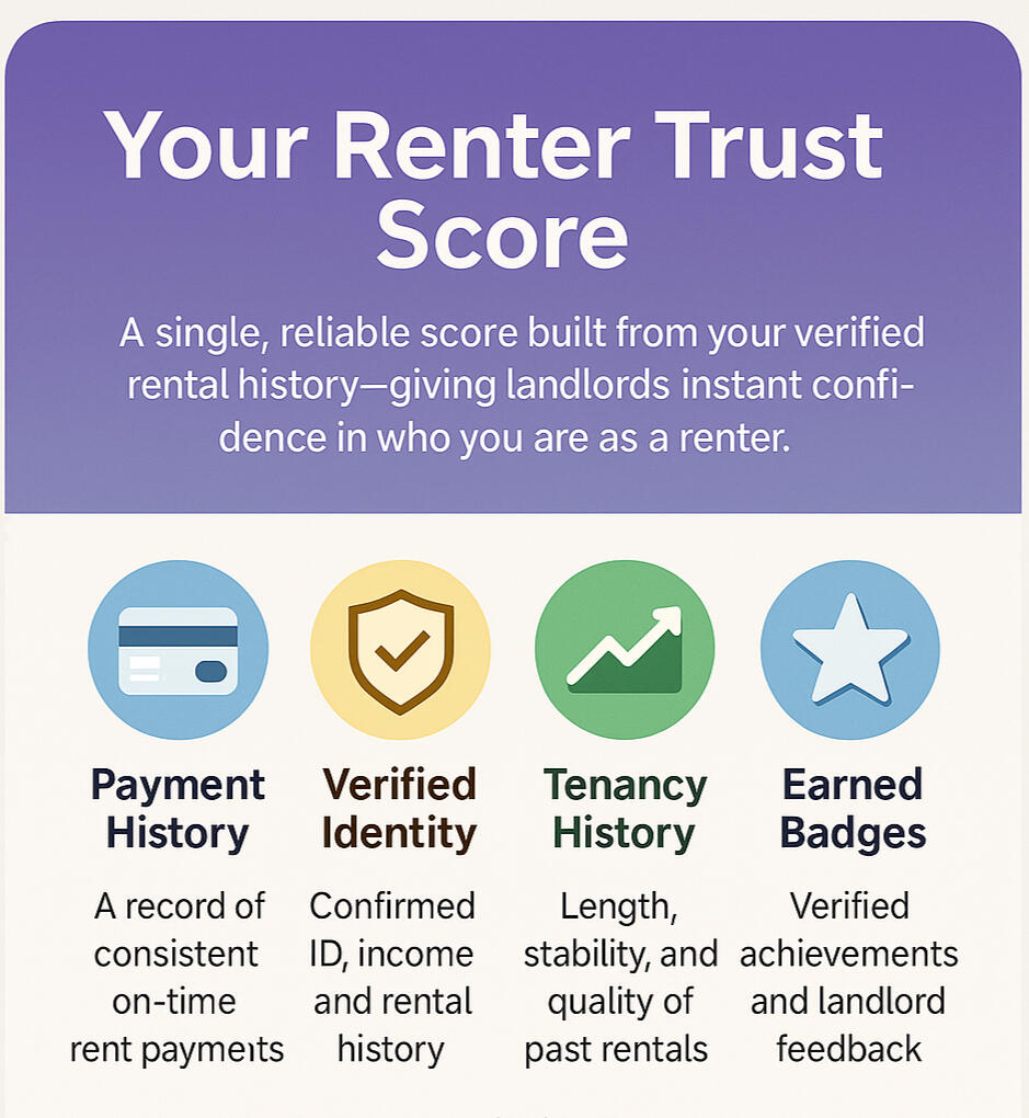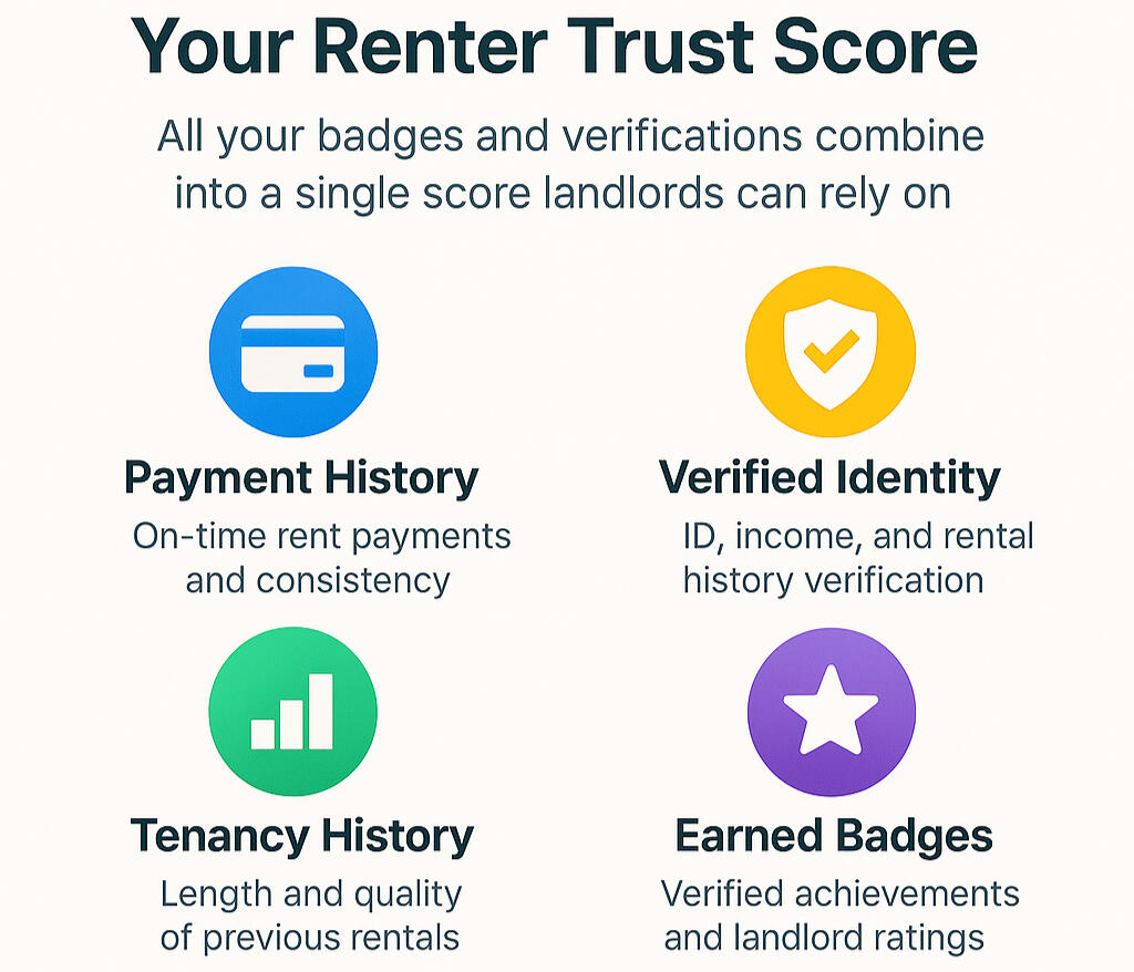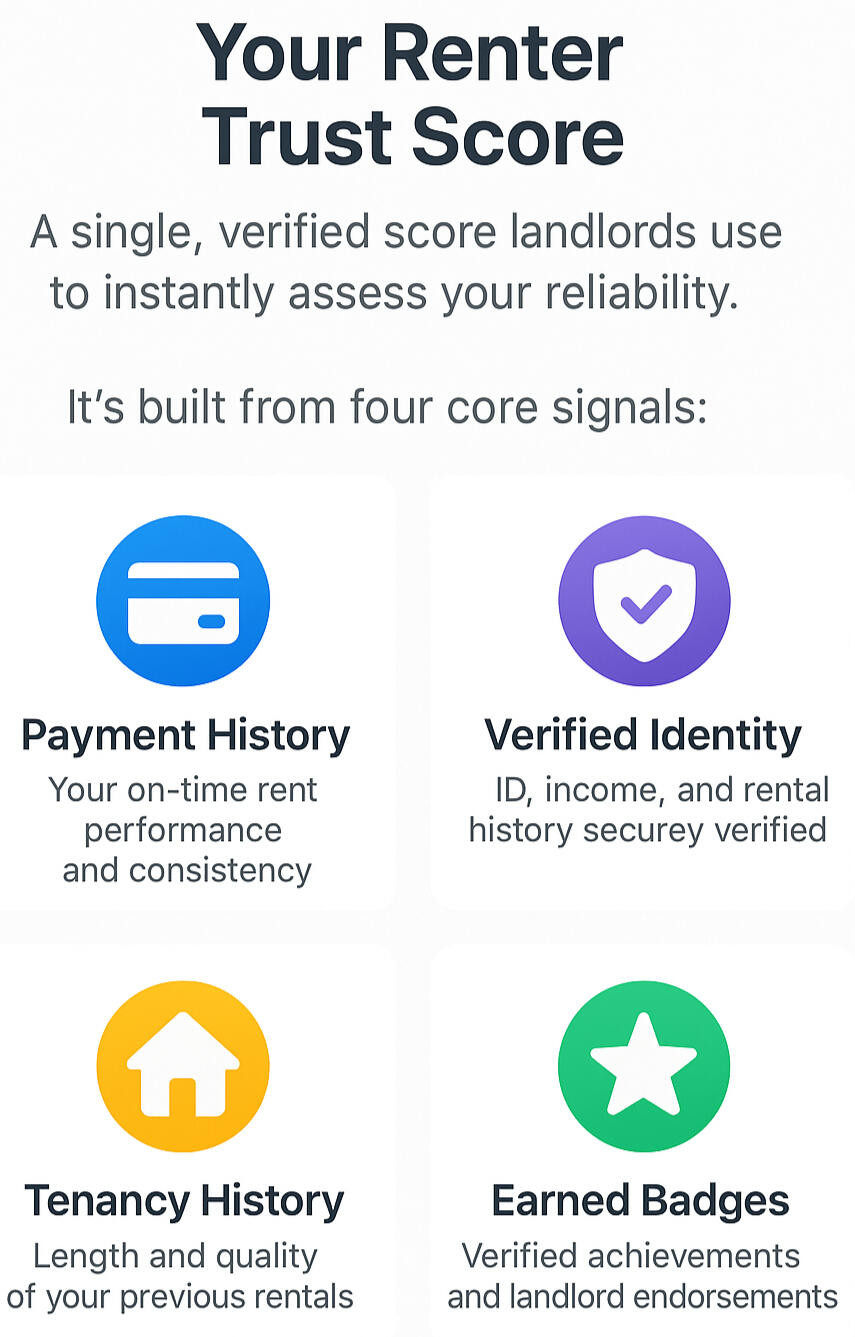 Your Renter Trust ScoreA single, verified score landlords use to instantly assess your reliability.It’s built from four core signals: