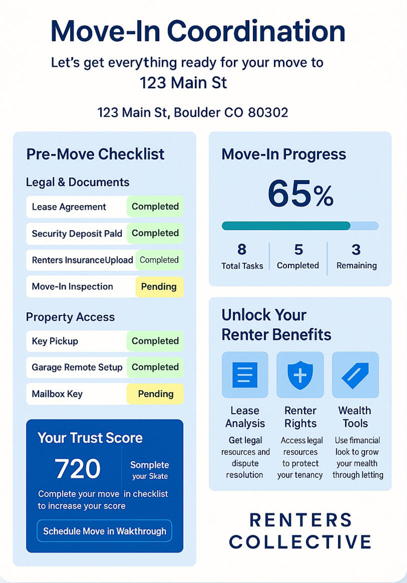 Your Renter Trust ScoreA single, verified score landlords use to instantly assess your reliability.It’s built from four core signals: