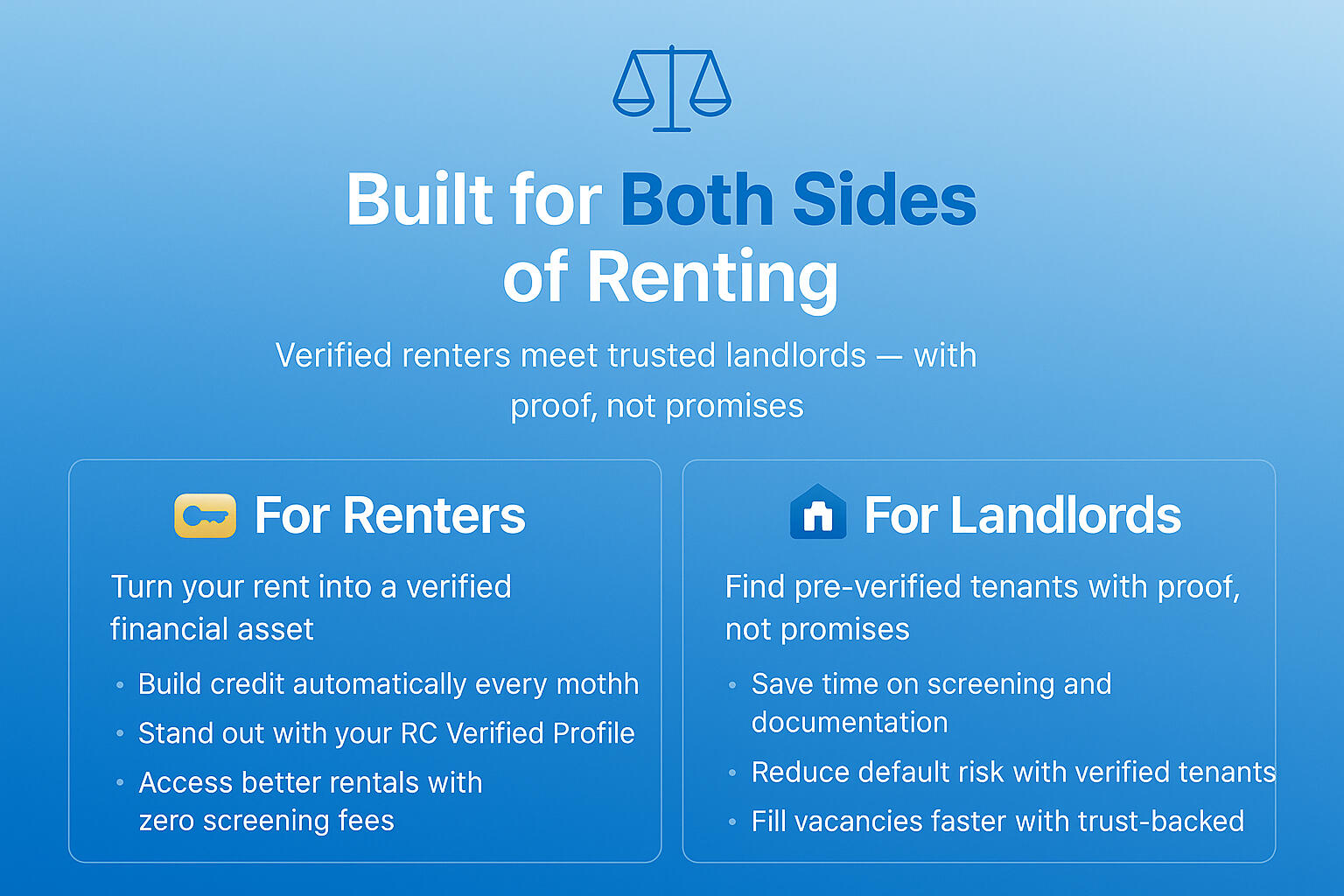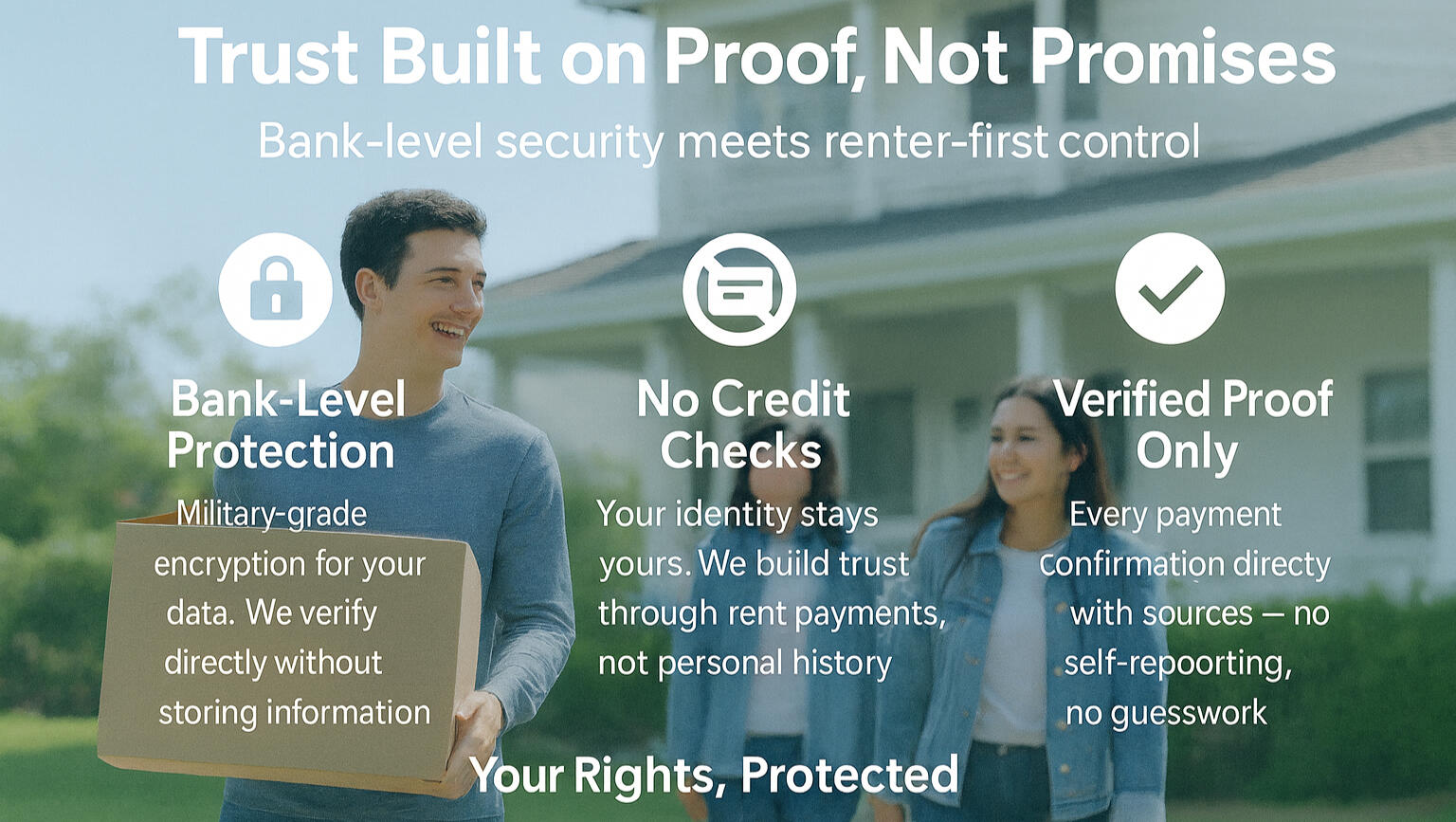 We verify at the landlord-level, not just credit data level. This means your housing history gets the same weight as mortgage payments. Plus, we're built specifically for renters—always free, no credit checks, and designed to give you the verification power usually reserved for property owners.
